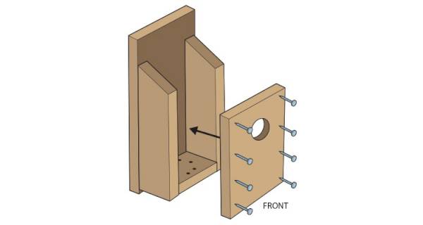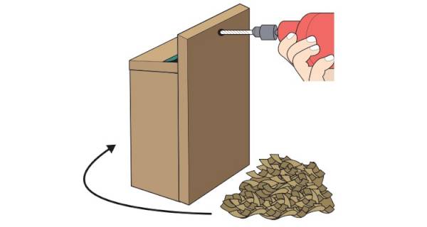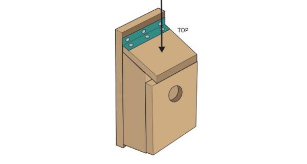 Drill a hole through the top of the ‘Back' section to be used later for installing the box outside. At this stage, you can add some bedding to the box if you wish in the form of wood shavings.