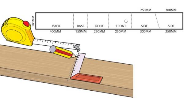 Start by using your pencil, tape measure and building square to section off your plank of timber like the diagram shown below. Make sure you label each section clearly.