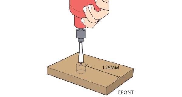 On the section marked ‘Front', use your flat wood bit to drill out the entrance hole. Make sure this is at least 125mm from the bottom. Another key point here is to leave the edges rough, this will help future baby birds get out.
