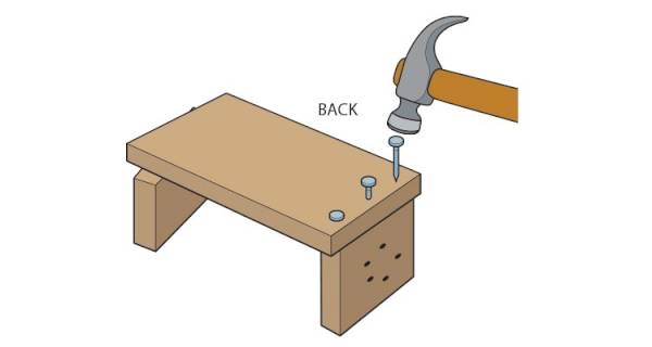 Using other sections as support, nail the ‘Back' section to the ‘Base' section, using the hammer and wood nails. Use as many nails as you need to ensure sturdiness leave about 1-2cm between nails.