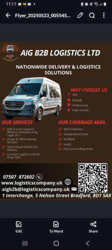 AIG B2B LOGISTICS LTD is a Bradford-based logistics company offering reliable B2B courier and house moving services across the UK. We specialize in time-sensitive deliveries for industries like healthcare, manufacturing, and retail, providing both contract and pay-per-drop pricing options. Our house moving service ensures safe, stress-free relocations with professional care. With a trusted team and flexible fleet, we focus on speed, safety, and excellent customer service. Whether you're a business needing dependable delivery or a family planning a move, AIG B2B LOGISTICS LTD delivers peace of mind every step of the way.