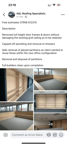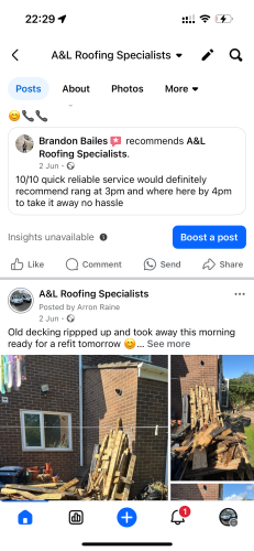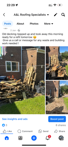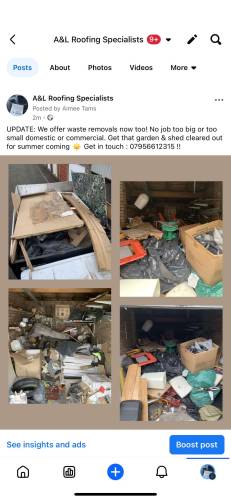 A&L roofing and waste specialistsContacted me immediately on viewing my pics to advise me on the black mould situation following a massive leak from the roof in my Summerhouse. Shaun and Aaron came the next day to view and quote for the work required to repair and re felt the roof . Reassured me it wasn’t as big a job I anticipated. Booked in to do the work 2 days later and job done within 4 hours. Shaun coming back to tidy the edges once the felt shrinks back. Felt they were both really honest in the work needed, no idea whether the price was competitive or not, it just needed doing and these guys were able to squeeze me in. They took all rotted materials away too which was a bonus and left the place tidy. In the spring I aim to declutter the summerhouse and as this company does rubbish removal, I’ll definitely be in touch for a quote. Thanks so much, so relieved I don’t have to stress every time it rains now 😊