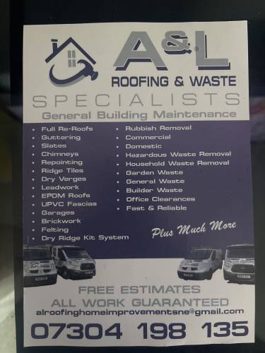 A&L roofing and waste specialistsEveryone I've dealt with from this company has been professional and helpful. The job was completely really quickly and they were happy to work around our availability. The work looks to be completed to a high standard and everything was left really tidy with the waste taken away. We have a 10 year guarantee and a contact number if there's any issues, I don't anticipate there being any problems.Really pleased with the work and would be happy to recommend or use again.