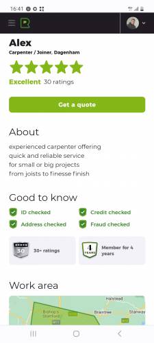Professional carpenter and joiner with great attention to details, and great pro active attitude to fix things around house. I shall definitely ask him for help next time if I need something to do. Alex was punctual, consumer focused, gave lots of useful tips how to maintain or fix other things. He came and fitted fire door with frame, bi fold doors and cut 2 other doors.