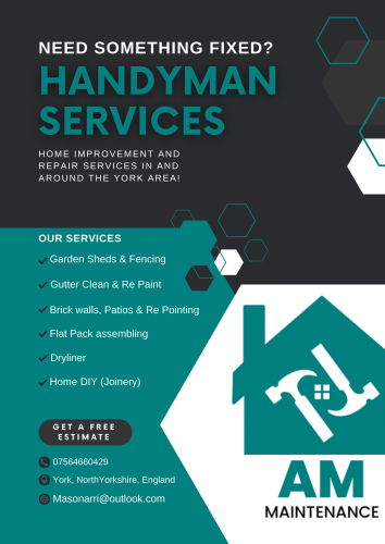 I’m a self employed multi skilled worker with a NVQ in sign making which covers joinery, welding, assembly, acrylic work in house work using different machinery I.e bench saw, wall saw, flame polishing and more. While also travelling around the uk fitting shop fascia’s. Working in the construction industry for well over 7 years i have gained many skills working along side Bricklayers building (patios, brick walls, houses) & Dry liners in (hotels, houses, building site) learning how to plasterboard rooms, finally working with Gardeners and Tilers fitting fencing and patios. I work full time on building sites and this is the start of my own business. Thanks for choosing us! AM Maintenance