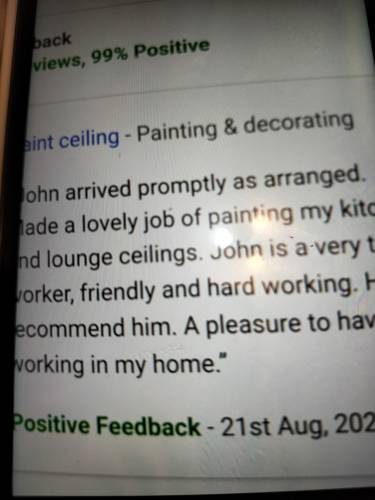 We are very pleased with the work that John has recently completed for us. He was really quick but did a great job painting walls, ceiling and woodwork. He arrived on time and left everything clean and tidy. He was very reasonably priced too. Would highly recommend him.