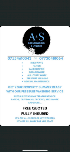 Driveways, Patios, Landscaping, Groundwork, All utility work, Pressure washing and General maintance.