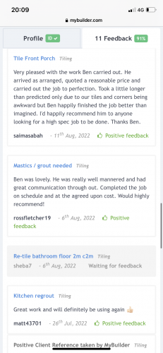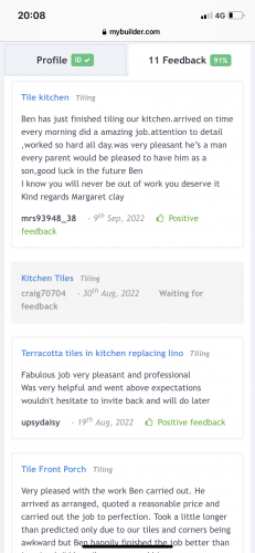 Ben did an excellent professional job tiling our porch, hallway and kitchen. I can't recommend him highly enough.