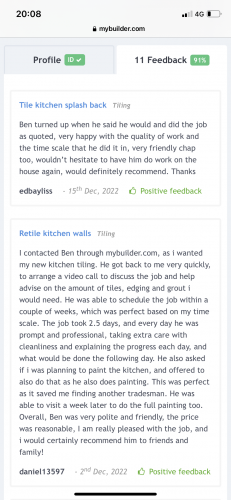 Ben did a great job with the tiling. Would recommend him to anyone seeking a tiler. Would definitely use Ben again. Thanks Ben