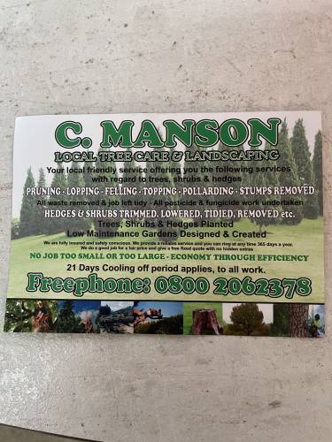C. Manson tree care & landscaping we have over 15 years experience in tree & llandscaping business all work done to a high expectation and to customers satisfaction