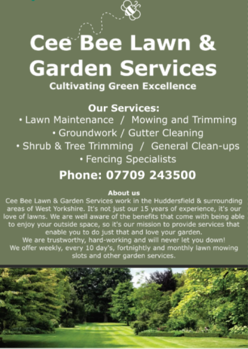 Cee Bee Lawn & Garden Services work in the Huddersfield & surrounding areas of West Yorkshire. It's not just our 15 years of experience, it's our love of lawns and gardens. We are well aware of the benefits that come with being able to enjoy your outside space, so it's our mission to provide services that enable you to do just that and love your garden.