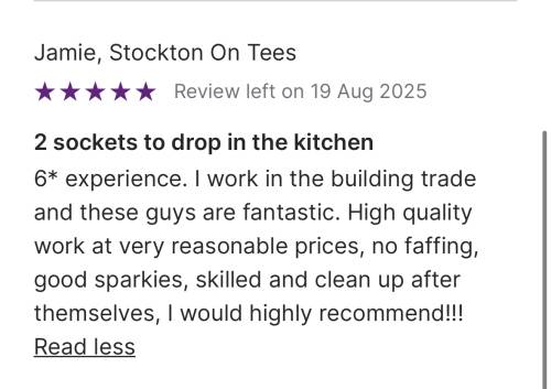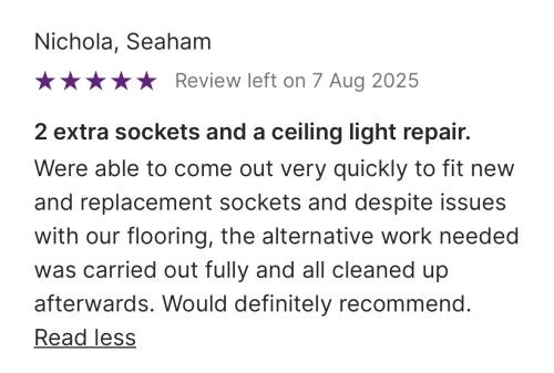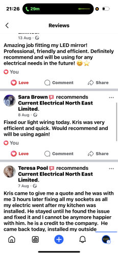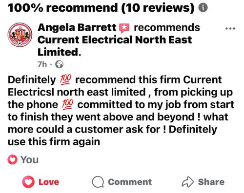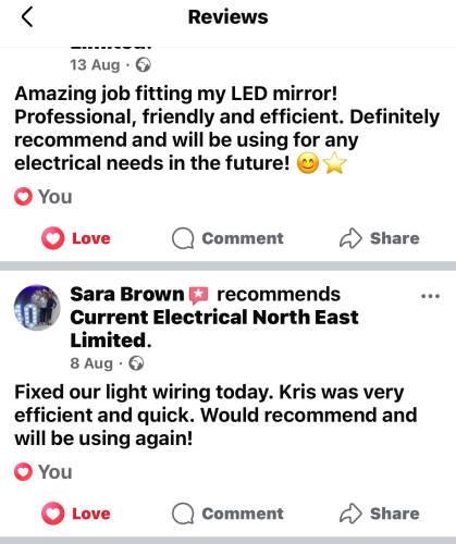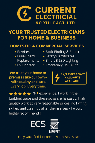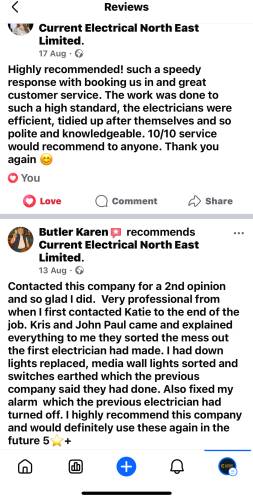 I would highly recommend Current Electrical North East limited, from the first contact with Katie information was clear and concise, a quote was provided within 24 hrs of the site visit and a date agreed, the Team were a joy to work with, arrived on time, hardworking and at every stage information was explained, I wouldn't hesitate to recommend this company