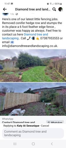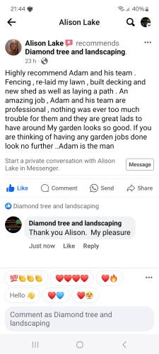 As a woman living on my own the thought of having unknown men come to my home was quite an intimidating prospect, but that was not an issue at all with Adam and his colleague, both were extremely friendly and professional. My experience with Diamond Tree & Landscaping has been overwhelmingly positive - all communication has been prompt and clear, the pricing extremely reasonable and fair, and I'm very pleased with the work carried out! I'd definitely recommend their services and would feel confident contacting them for any future garden needs I may have.