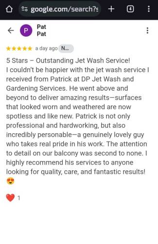 Patrick provided a great service and cleared up after his work. He even power hosed a roof window which I did not ask but very grateful. I will have him do my front drive when he’s available!