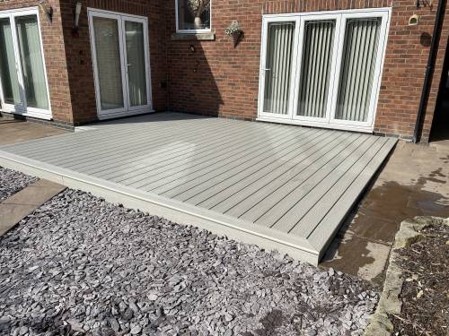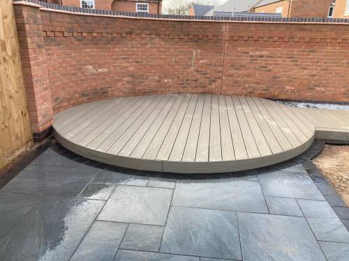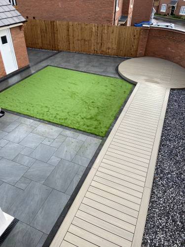 Composite decking, artificial grass and garden walls.
