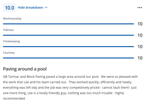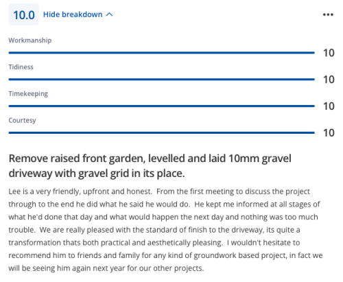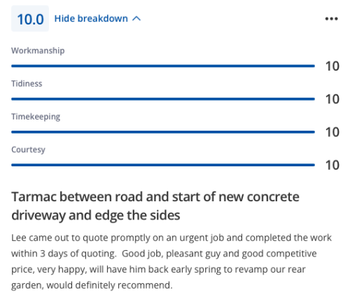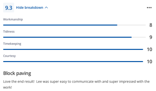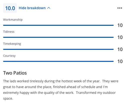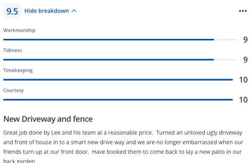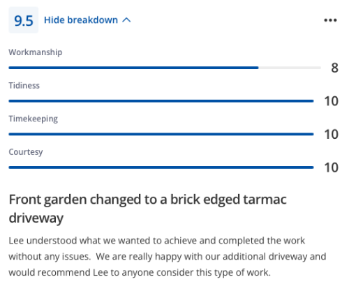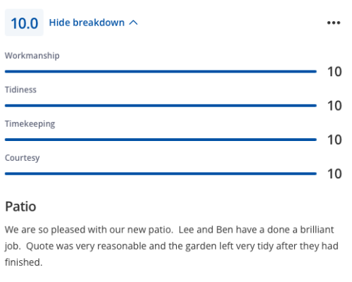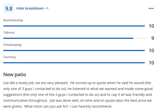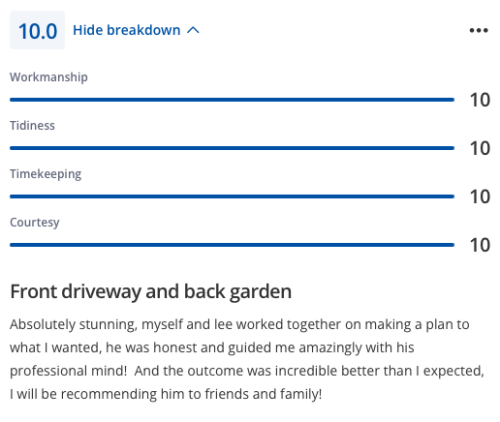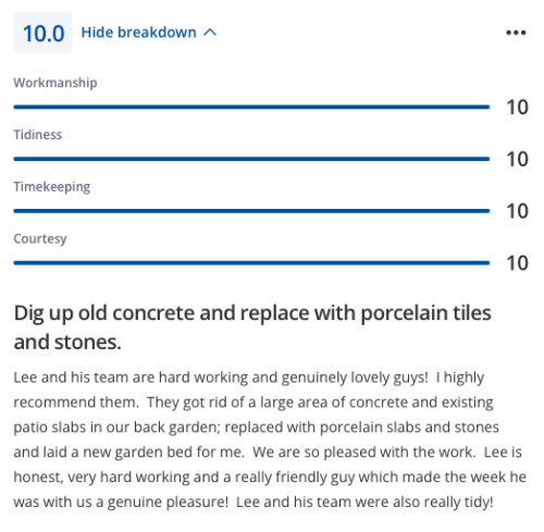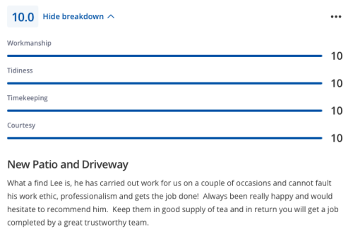Lee and his team completed by patio extension and did a really excellent job. Fair price, great communication and managed to fit the job in, in a good lead time. Very happy with the job - would highly recommend Lee and will use for any future works.