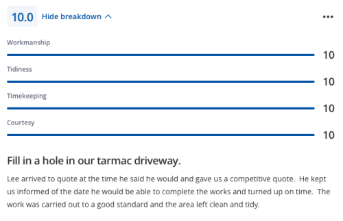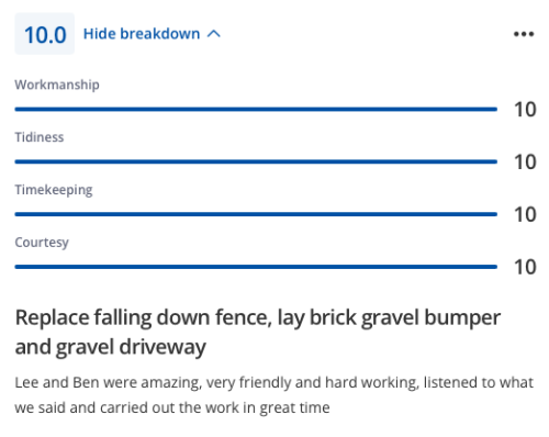 Quick response, got in touch as soon as I posted the job, came out to quote the following day, and returned within 24 hours to complete the job! Would 100% recommend (a replacement fence panel)