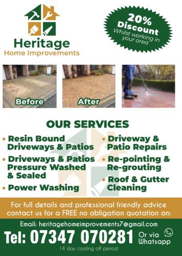 At heritage home improvements be provide pressure washing of patios guttering and driveways to a high standard of work.