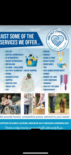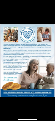 At home help and companionship we offer help with daily chores as well as offering companionship enabling the elderly to remain independent and live in their own homes .