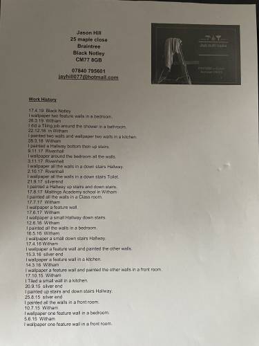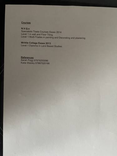 I am 37 years old I am a experienced painter and decorator with 8 years experience I have Level 1 in painting And Decorating, health and safety certificate at Highfields level one diploma horticultural at Writtle College in Essex level, 1 certificate in wallpapering and tiling and I have a Facebook page called Jays multi-trades of all my work and pictures what I’ve done.