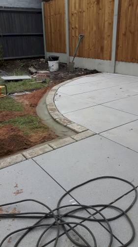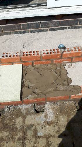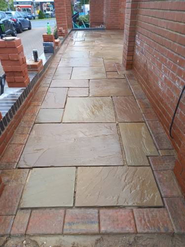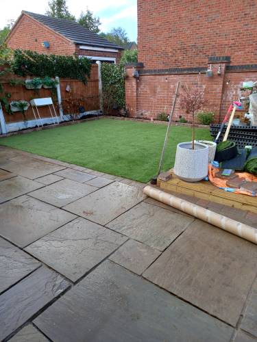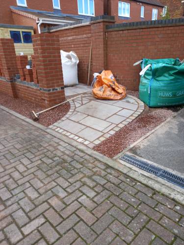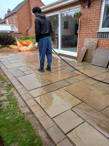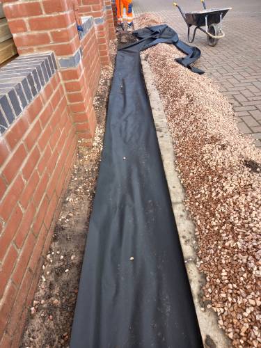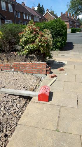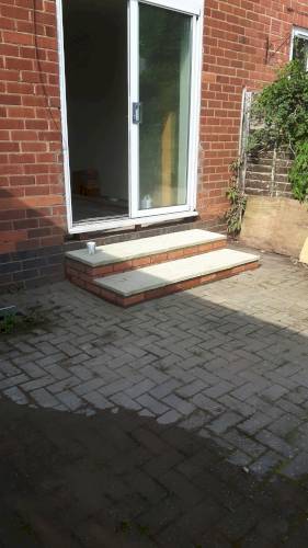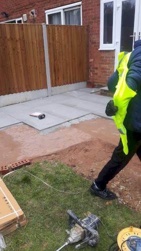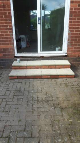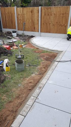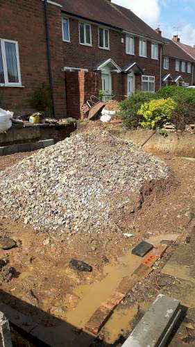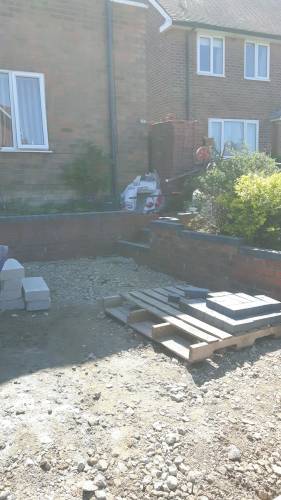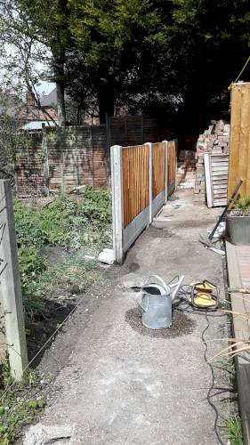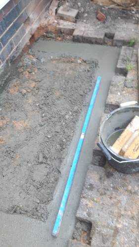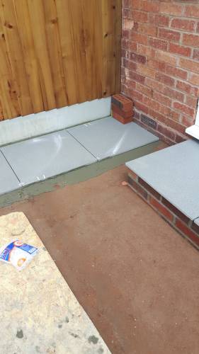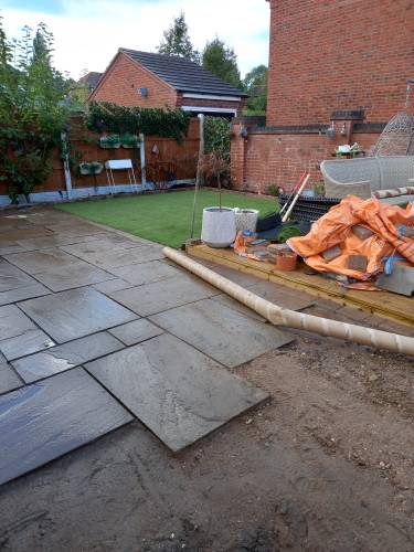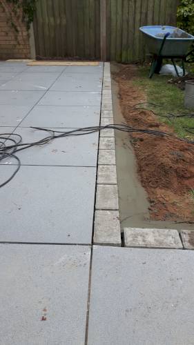 JK decided the slabs needed to be higher so he relaid them in mortar on top of a new gravel base. This has been very successful. When I swept them I was surprised they were bone dry despite recent heavy rain in Stoke. He also laid a French drain around the shed base to divert run off from neighbouring gardens which are higher than ours. The drain extends to the end of the garden. The drain changes to pipe and gravel further down. It all seems to be working well. JK assures me that if I have any problems he will return and address them.