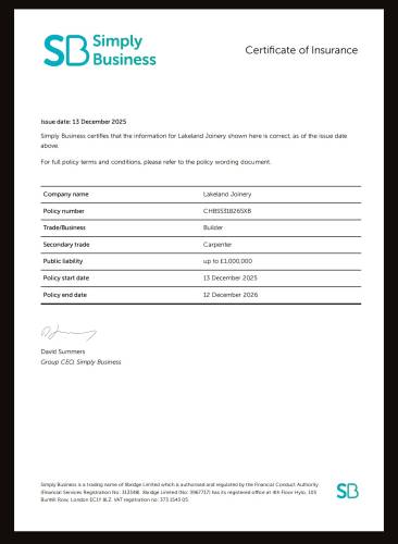 At Lakeland Joinery We are a trusted Joinery and Construction company, specialising in high-quality building works and bespoke joinery services. With a friendly approach and a commitment to problem-solving, we pride ourselves on delivering reliable solutions with exceptional attention to detail. Whether it’s a small project or a full-scale build, our team ensures every job is completed to the highest standard, tailored to meet our clients’ needs.