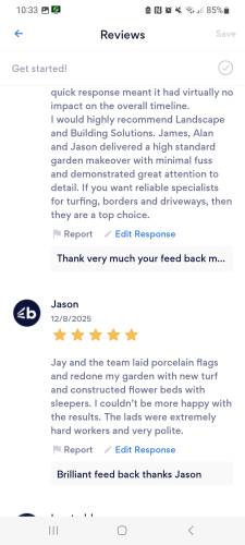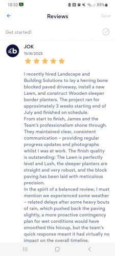 Absolutely made up with my garden, Designed and installed by landscape and building solutions. Work was professional. Time keeping exceptional. Communication perfect. Always felt 100% at ease Not a single issue from start to finish Highly recommended company. Thanks for everything jay be back in touch soon definitely. All the best.