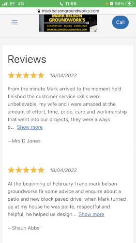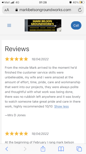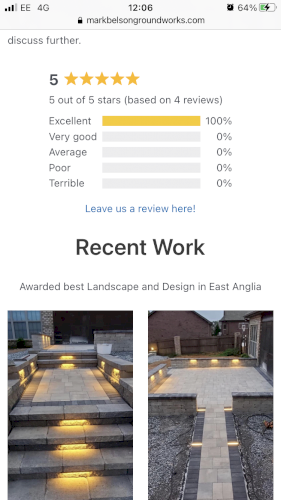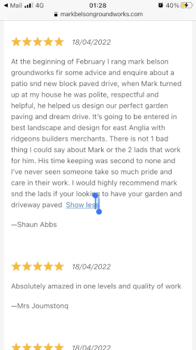 I can design and lay all types , sizes & patterns of all block paving & patios. I habe jus won an award for best landscape and design in east Anglia for 2022 with the local builders merchants, I’m NRSWA CERTIFIED which means I can change Kerbs’s to dropped kerbs fir driveway extensions or even a new driveway entrance, I’ve 25 years experience in: block paving, patios, turfing, decking, fencing, garden ponds, shed bases, brick barbecues, swimming pools, graveling drives, concreting, drainage, footings (dig and pour) all bricklaying, extensions renual of services (water, gas, electric, Bt, and laying of ducts to new builds. I have all relevant machine tickets and health and safety certificates that are required and a public liability insurance up to £1 million pounds, I ve over 25 years experience and references and reviews from recent happy customers and all my work is on my website Markbelsongroundworks, so I’d you would like a low maintenance garden or a dream driveway or garden patio message me on support@ markbelsongroundworks.com
