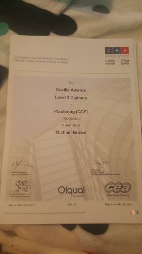 i have been a plasterer since being taught in college, 14 years ago. receiving my level 1 and 2 diplomas and have been employed/ self employed since leaving college gaining mass experience in my skill