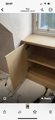 Excellent work, Mike was helpful, came within 30 minutes of being booked and did a really good job on my shelve and left everything neat and tidy, I would recommend Mike if you need a joiner