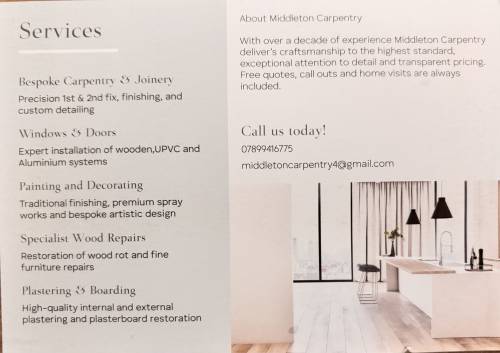 Middleton Carpentry delivers work to a very high standard. With over 10 years of experience across multiple trades, we pride ourselves on offering competitive pricing, free quotes, and free call-outs, including home visits
