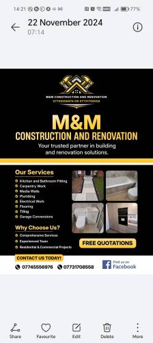 M&M Construction and RenovationAbout Our Reviews: The reviews contained on this page have been submitted by users of our service who have had a job completed by a verified trade member. We operate a closed loop feedback system which protects our users from fake reviews. To understand more about our reviews process, please visit our Reviews Policy.
