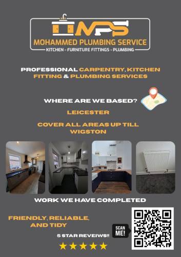 Mohammed Plumbing Service is a reliable and professional plumbing and kitchen fitting business based in Leicester, proudly serving customers within a 10km radius. With a strong reputation built on 5-star customer reviews, we are committed to delivering high-quality workmanship and excellent customer service on every job.