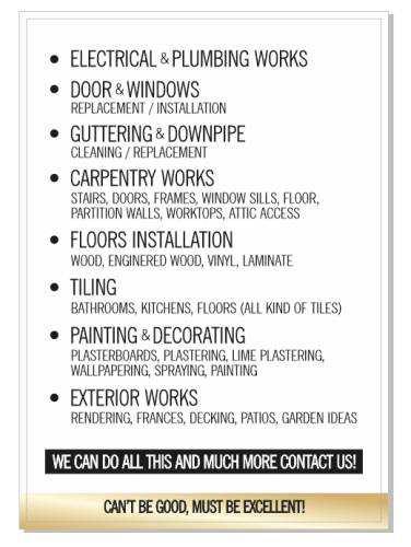 Our services include painting, plastering, tiling, flooring, electrical repairs, roof maintenance, and outdoor projects like patios, fencing, and garden makeovers.