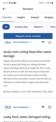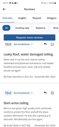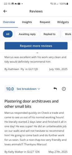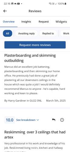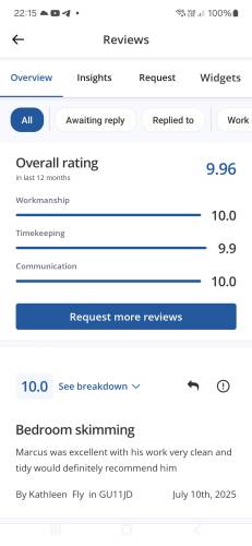 Mw plasteringMarcus did an excellent job battening, plasterboarding and then skimming our home office. He previously had done a great job of plastering our downstairs ceilings which was quite a job! I would definitely recommend Marcus to anyone - he's capable, hard working and keen to please.