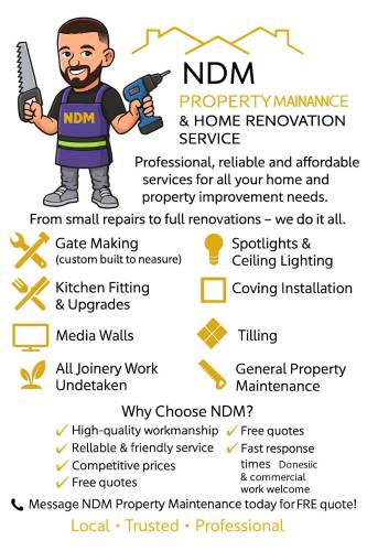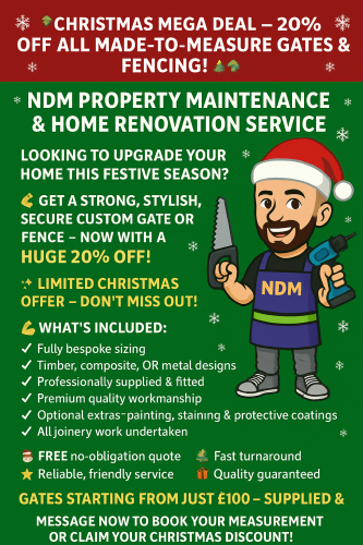 NDM Property Maintenance provides reliable, high-quality home improvement services. From gates and fencing to joinery, tiling, kitchens and lighting, we deliver trusted workmanship at competitive prices. Fast response, free quotes and all work guaranteed