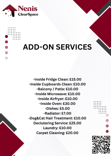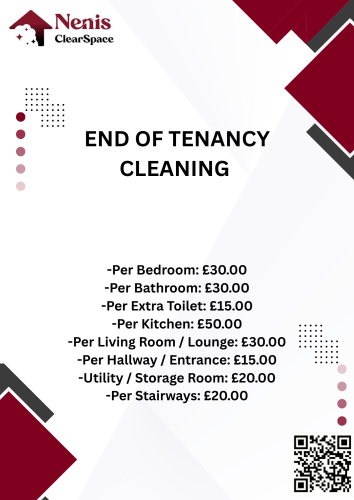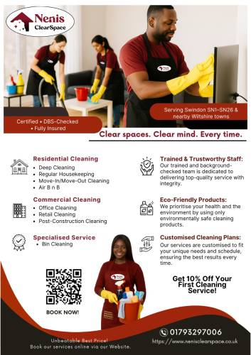 Nenis ClearSpace is an eco-friendly cleaning company based in Swindon, delivering reliable, transparent, and sustainable cleaning services. We specialise in home, office, Airbnb, move-in/move-out, deep cleaning, bin, and appliance cleaning. All our Cleaning Specialists are DBS-checked, fully trained, and covered by public liability and employer’s liability insurance for your peace of mind. With a strong focus on excellent customer service and punctuality, we make it easy to book, relax, and enjoy spotless results.