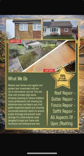 and protect your investment with our all-in-one exterior service. This one time visit includes high steam driveway cleaning to remove stubborn stains professional roof cleaning too eliminate moss and depris and a full gutter inspection beyond just cleaning we provide essential repairs to ensure proper drainage and prevent water damage it’s a total exterior reset designed to keep your home safe, functional and looking brand-new