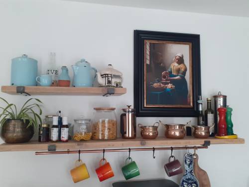 Shelf in Kitchen - Designed, handmade shelves and bespoke made copper cup rail and Fitted.