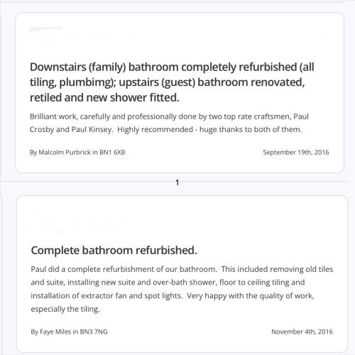 We have excellent job references, job reviews on bathroom refits, shower room refits, waterproofing wet rooms, shower panel fitting, wall and floor tiling, re-sealing baths and re-sealing showers from other trade websites if requested to be viewed we do free estimate / quotation.