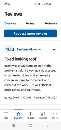 Ive been in buisness for 10 years and cover Kent and Croydon areas. I carry out all new work and roofing repairs and supply free quotes, all of my new work comes with a 10 year guarantee. I also cover emergency and insurance jobs. For more information about my company please contact me and ill happily answer any questions you may have.