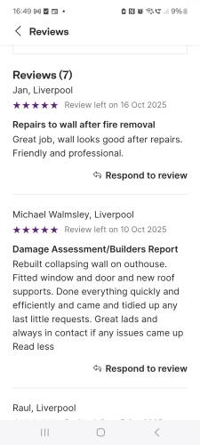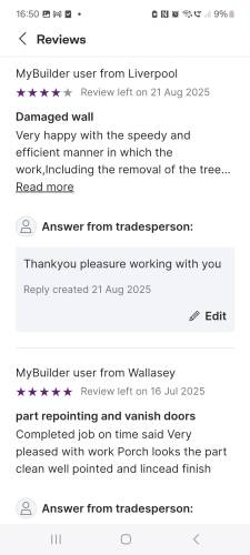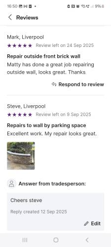 Matty, Stephen ( I think his name is? and Lewsi, were great, what can I say? They came late because of a problem with one of the wheels on the van, they were here for a few hours, Stephen doing a great job pointing part of the back of our house and Matty fixing the boundary wall between nextdoor and us, at first our neighbour was out so there was a bit of a wait but, no sooner he had returned, Matty did the job that RN Builders had made a mess of as that came apart within the week it was "fixed" then, Raph was giving orders to George who looked about 70+ it was not pinnied a promised either. We wish we could give more stars. Highly recommended. Thank you lads, thank you very much.