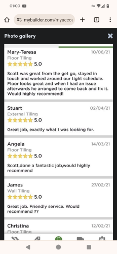 Hi Im Scott of SSR Tiling. I;ve been a tiler for 21 years and do all kinds of tiling work. Im fully qualified and certified.
