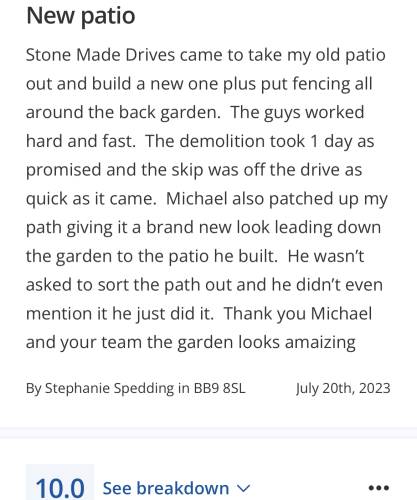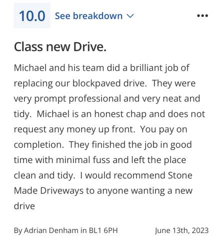 Have to say Michael and his team done a brilliant job on my driveway couldn’t recommend this company anymore. Thank you stone made driveways