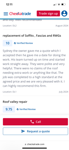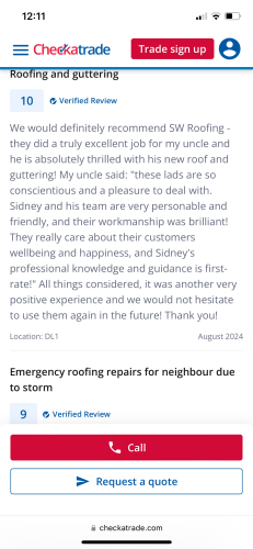 Sw roofing is a small but highly recommended roofing business based in Darlington. Where proud to say we have score of 10 out 10 based on 270 reviews over a ten years period please feel free to look us up on checkatrade. We are fully insured and can offer previous work to view and recommendations from all of the northeast and Yorkshire. We try to pride ourselves on quality service and value we would always try to beat any genuine quotation and offer discounts for senior citizens. Some of our service includes upvc fascias soffits and guttering/ flat roofs inc traditional mineral felt grey or green / rubber roofs / Grp glassfibre / roof repairs / full new house roofs re roofs / dry ridge services / dry verge/ all repointing work/ roof cleaning and driveway cleaning services