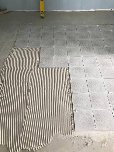 Spread adhesive onto ready surfaces and tiles, then set tiles in position