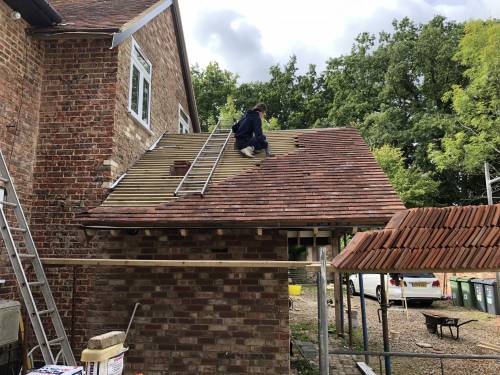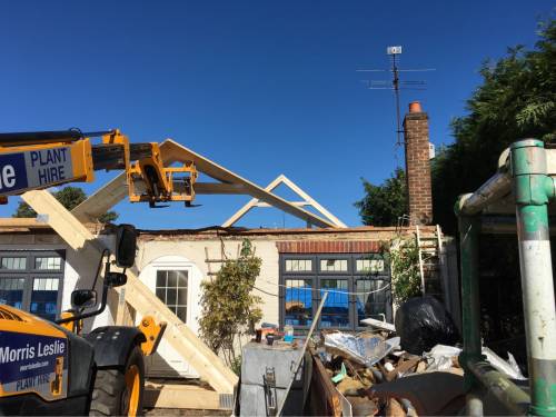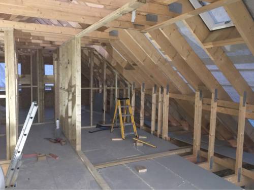 This entailed extending at the back, taking off the entire roof, and installing preformed attic trusses. insulate, felt, batten and tile roof and install Velux windows.