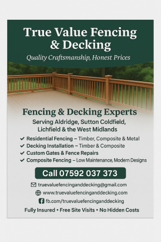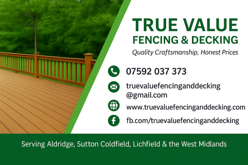 At True Value Fencing and Decking, we provide high-quality fencing, decking, and gate installations across Lichfield, Sutton Coldfield, Aldridge, and the wider West Midlands. With years of hands-on experience, we pride ourselves on offering reliable workmanship, honest pricing, and a friendly, professional service from start to finish.